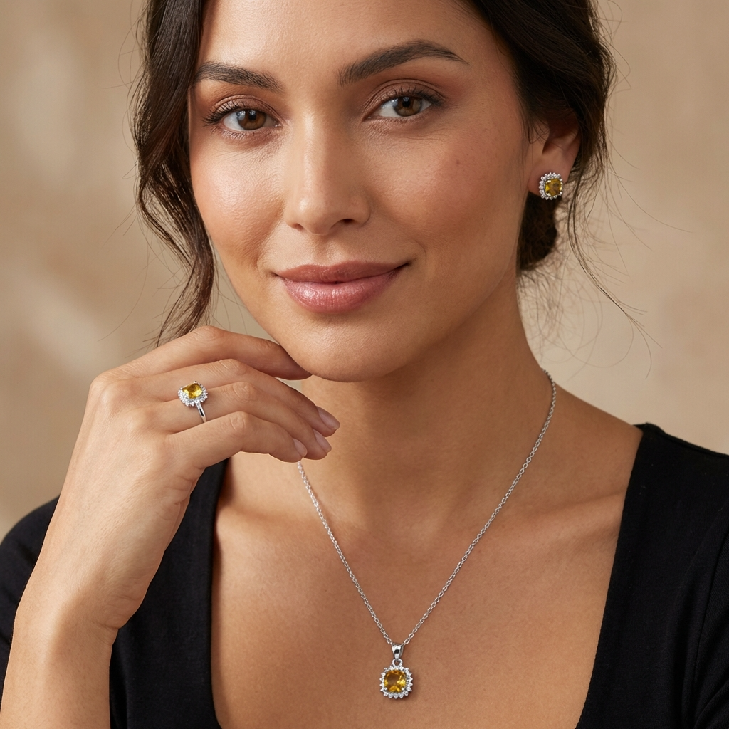 Ανακαλύψτε την ομορφιά και την κομψότητα αυτού του πανέμορφου Σετ από Ασήμι 925, με εξαιρετικής ποιότητας Αυστριακούς Κρυστάλλους σε χρώμα Κιτρίνη και μέγεθος ~10mm διακοσμημένο με λαμπερά Ζιργκόν.