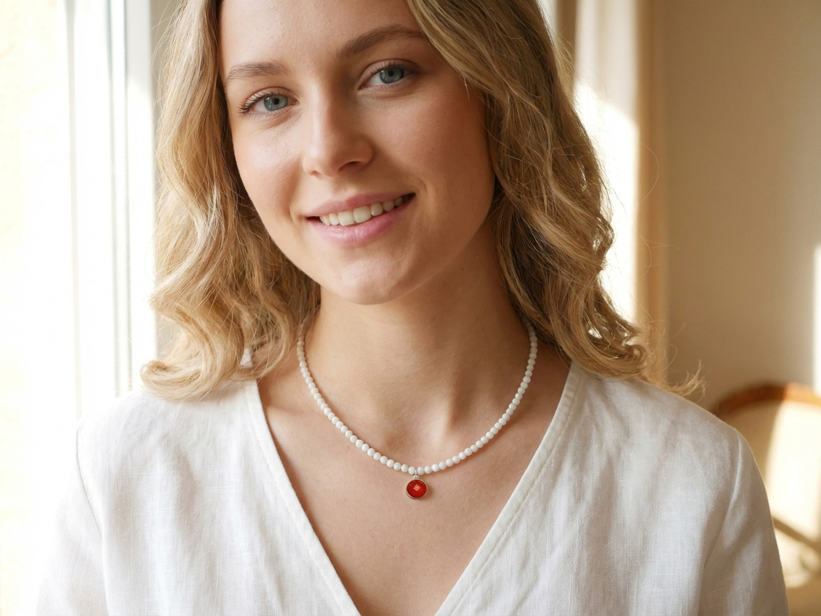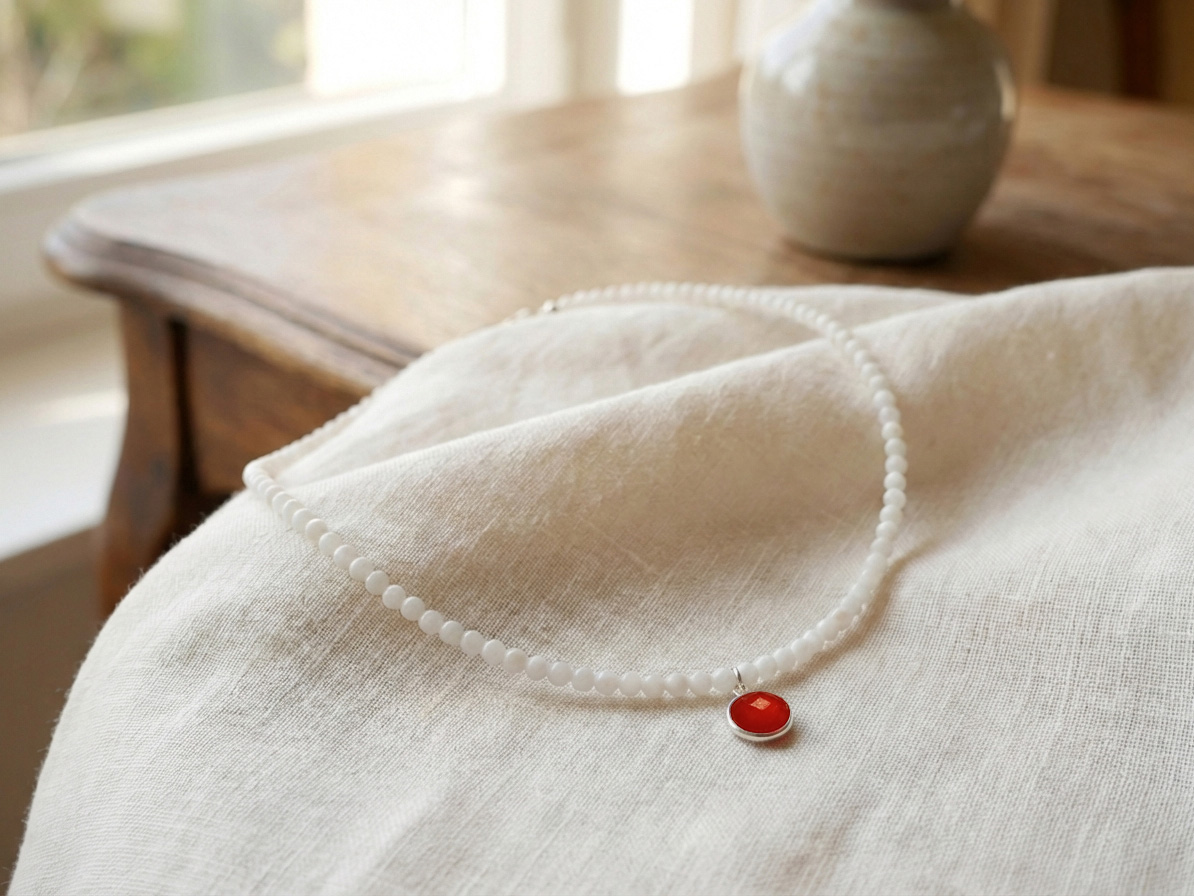 Κολιέ Ημιπολύτιμοι Λίθοι Αχάτη Ταγιέ σε χρώμα Λευκό Μέγεθος Πέτρας ~4mm και Ασημένιο Μενταγιόν Νεφρίτη 8mm σε χρώμα κόκκινο, Κούμπωμα Ασήμι 925, Μήκος ~41cm.