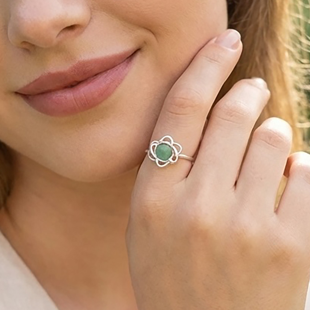 Δαχτυλίδι Λουλούδι Ασήμι 925 με Ημιπολύτιμο Λίθο Αβεντουρίνη mat σε χρώμα πράσινο 6mm. Ρυθμιζόμενο μέγεθος.